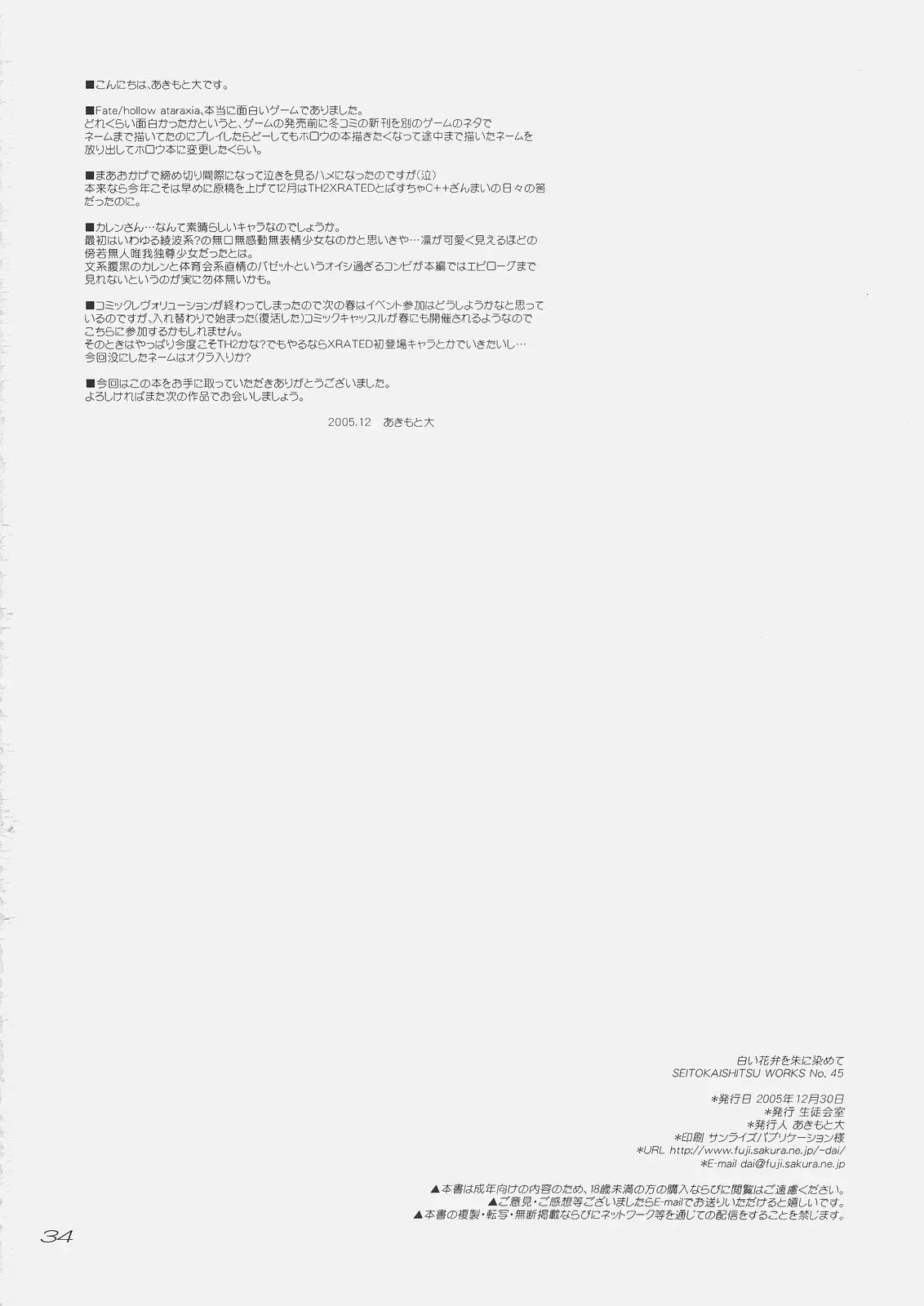 (C69) [SEITOKAISHITSU (Akimoto Dai)] Shiroi Karen o Aka ni Somete (Fate/hollow ataraxia) Hentai (C69) [生徒会室 (あきもと大)] 白い花弁を朱に染めて (Fate/hollow ataraxia)